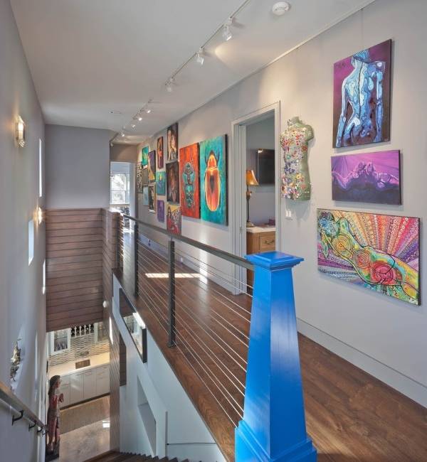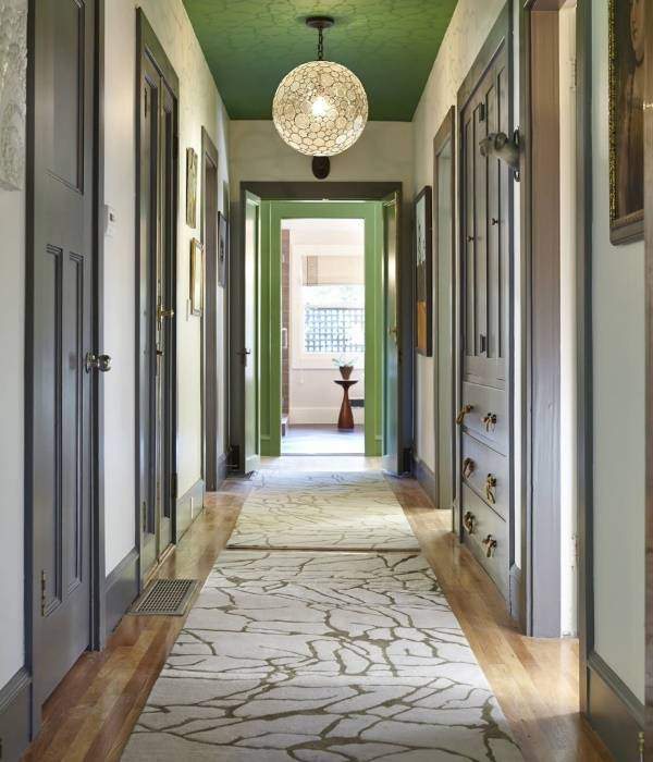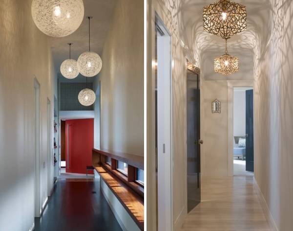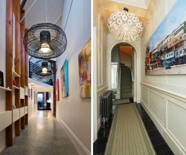 Декоративные подвесные и потолочные светильники добавят стиль и уют дизайну узкого коридора, особенно в сочетании с картинами или другим настенным декором.