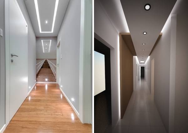 Точечные светильники и встроенная подсветка светодиодной лентой позволяют осветить самый тесный и маленький узкий коридор, и даже придать ему необычный стиль.