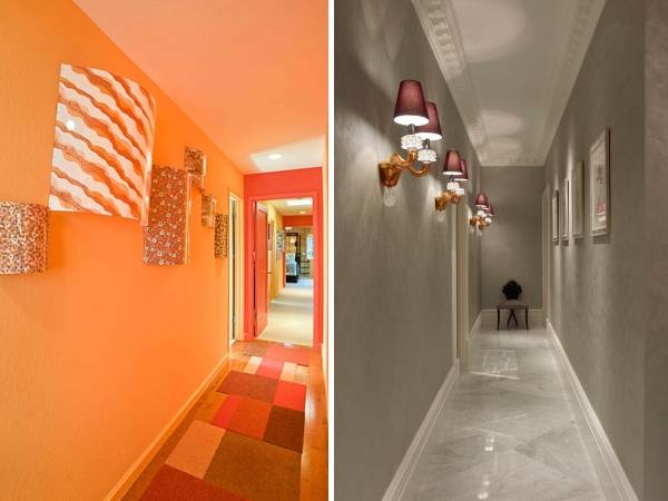 Например, популярным выбором для длинного узкого коридора являются настенные светильники. Подвесьте бра возле зеркал, стеклянных или других блестящих элементов в коридоре и они красиво разобьют пространство и придадут изысканный штрих скучной длинной стене.