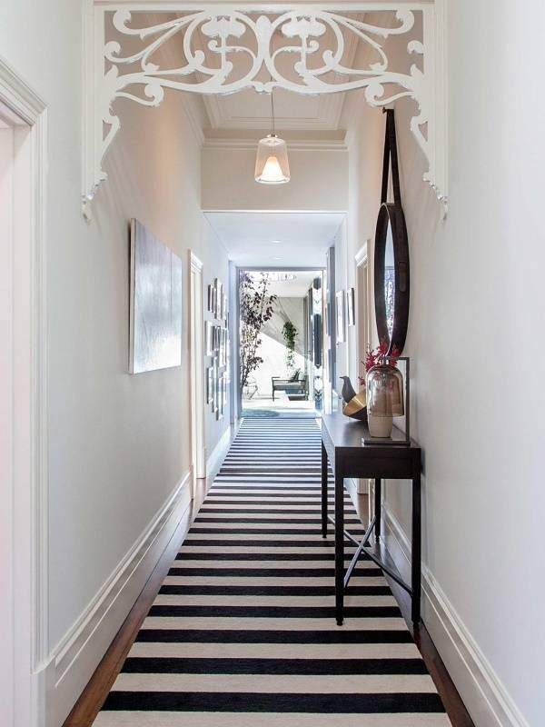 Узкий коридор будет казаться шире, если вы украсите его светлой ковровой дорожкой, особенно в горизонтальную полоску. Это же относится и к деревянным напольным покрытиям — укладывать доски рекомендуется перпендикулярно, а не параллельно стенам. Два ковра помогут визуально разбить и принести уют в длинный узкий коридор.