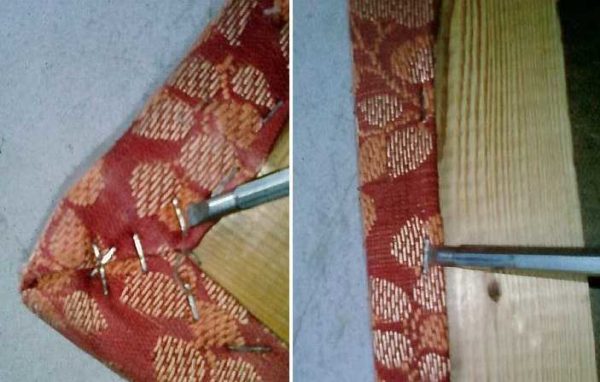 Следующий шаг — отделяем ткань от каркаса. Она прикреплена скобами к деревянным брускам каркаса. Скобы поддеваем плоской отверткой, вытаскиваем. Некоторые могут сидеть очень плотно, вытащить их проще захватив за приподнятую спинку плоскогубцами или пассатижами.