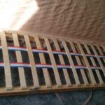 Лента прибивается с одной стороны к каркасу. Профессиональные мебельщики ее потом натягивают при помощи специального инструмента, но заменить его можно обычным бруском, обернутым вокруг по середине наждачной бумагой с крупным зерном. На этот брус наматываете пару витков ленты, двумя руками тянете (следите, чтобы рама не гнулась), ленту фиксируете скобами или гвоздями, отпускаете и обрезаете излишек. Этот же способ подходит и для повышения срока службы матраса на ламелях.