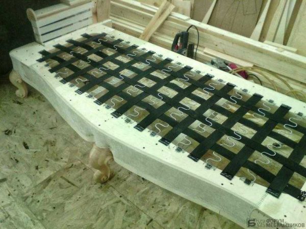 Чтобы увеличить эластичность и продлить срок эксплуатации, при перетяжке дивана количество «змеек» можно увеличить. Еще один вариант — поперечное укрепление жесткими корсажными лентами (которые используют для лямок на сумках, рюкзаках).