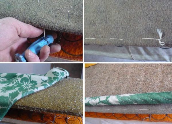 Поверх пружин следует положить какой-то плотный материал, обычно это войлок. В данном случае использовано старое напольное покрытие. Что-то типа войлока. Оно достаточно плотное и прочное. Складываем в два слоя, вырезаем по размерам. Этот слой надо прикрепить к пружинному блоку. Покрытие плотное, иголкой его не проткнешь, даже цыганской. Подойдет шило большого диаметра, но его нет. Протыкаем покрытие гвоздем, который проталкиваем ручкой отвертки. В проделанные отверстия продеваем толстую нить. Шаг стежков — около 3,5 см. Для ускорения процесса используем сразу несколько гвоздей.