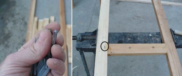 Сначала соединения проклеиваются, зажимаются в тиски. Под шкант засверливается отверстие небольшого диаметра, заколачивается шкант. Рама стоит в тисках до высыхания клея.
