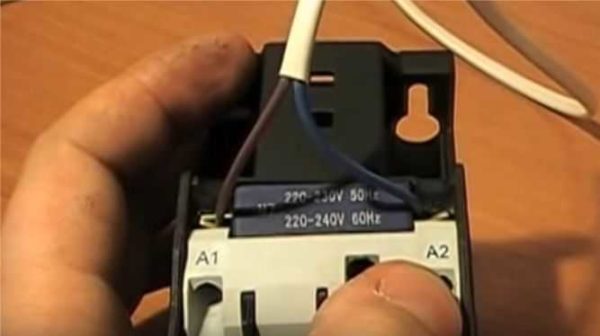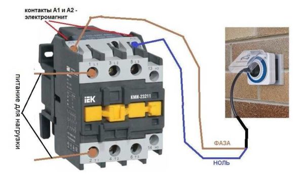 При подключении однофазного питания к катушке неважно на какой вывод подавать ноль, а на какой — фазу. Можно провода перекинуть. Даже чаще всего на А2 подают фазу, так как для удобства этот контакт выведен еще на нижней стороне корпуса. И в некоторых случаях удобнее задействовать его, а «ноль» подключить к А1.