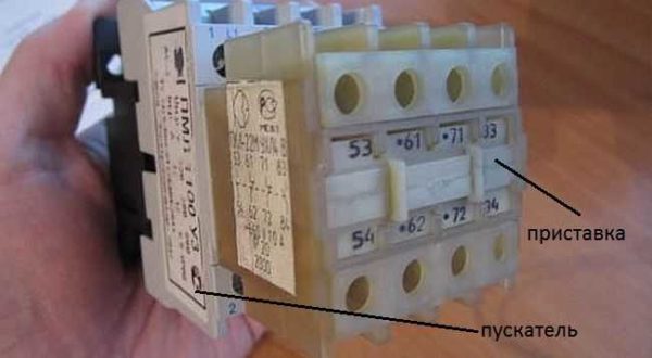 Так как нормально замкнутые контакты есть не во всех пускателях, можно их взять, установив дополнительный блок с контактами, который называют еще контактной приставкой. Эта приставка защелкивается в специальные держатели, ее контактные группы работают вместе с группами основного корпуса.