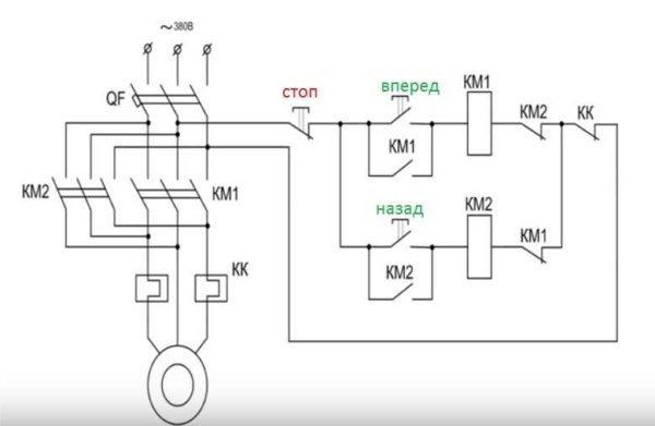 Реверсивная схема подключения трехфазного двигателя через магнитные пускатели