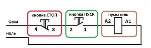 Магнитные пускатели чаще всего ставят для включения электродвигателя. Работать в таком режиме удобнее при наличии кнопок «пуск» и «стоп». Их последовательно включают в цепь подачи фазы на выход магнитной катушки. В этом случае схема выглядит как на рисунке ниже. Обратите внимание, что