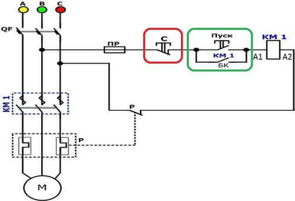 В этом случае после возвращения кнопки ПУСК в исходное состояние, питание продолжает поступать через эти замкнутые контакты, так как магнит уже притянут. И питание поступает до тех пор, пока цепь не будет разорвана нажатием клавиши «стоп» или срабатыванием теплового реле, если такое есть в схеме.
