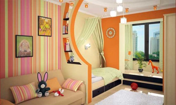 Такой же принцип можно применить в детской. В этом случае поклейка обоев двух видов служит для разделения игровой части, кровати, стола. Также поступают, если в детской обитает два ребенка. Только это возможно, если между ними отсутствует конкуренция, иначе количество конфликтных ситуаций может увеличиться.