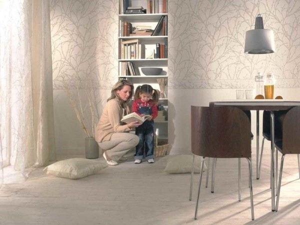 Вообще, поклейка обоев двух видов требует внимательного подбора текстуры и толщины полотен. При комбинировании желательно использовать однотипные полотнища. Если стыковка происходит только в углах, то можно на толщину и фактуру особого внимания не обращать: все равно особо не рассмотришь в таком месте. А вот если соединение полотен на ровной стене, то разница в толщине будет лишь подчеркивать переход. Смотрится это, как правило, слишком утрированно.