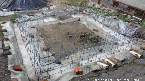 Основание помыли, просушили. Уложили готовую стеку из проволоки 6 мм с шагом 10 мм. Сетку связали с выпусками арматуры из ножа. Ее выставили на кусочки досок, которые по мере заливки убирали.