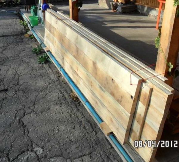 Далее бетон накрыли пленкой, периодически увлажняли. Пока он схватывался, собирали опалубку. Обрезную доску 40*150*6000 мм прошли рубанком, сбили щиты опалубки из четырех досок. По высоте они получились порядка 80 см. При сборке доски подгонялись плотно, чтобы раствор меньше вытекал.