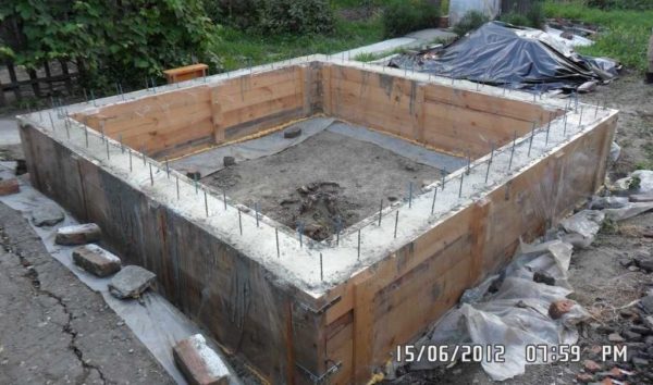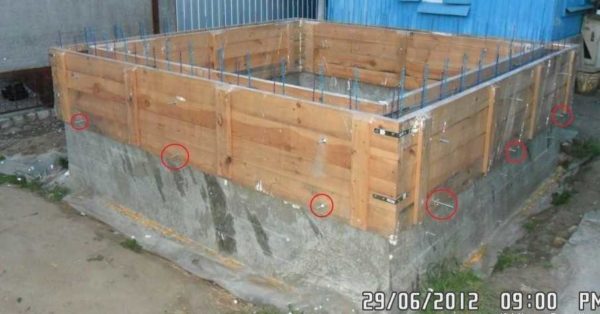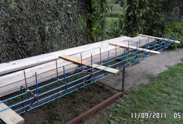 Далее, по «накатанной» технологии — привязываем арматуру, углы усиливаем, ставим опалубку. Только на этот раз, чтобы удобнее было ставить щиты, внутри, ниже края примерно на 15 см, набиты куски досок. В них упирается внутренний щит.