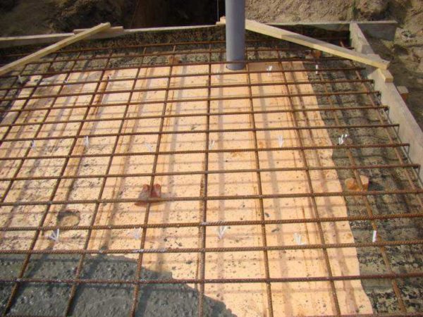 Поверх утеплителя из арматуры диаметром 10 мм связана сетка с шагом 20 см. Сетка опирается на куски кирпича. Она приподнята над ЭППС на 4 см, общая толщина плиты — порядка  10 см.