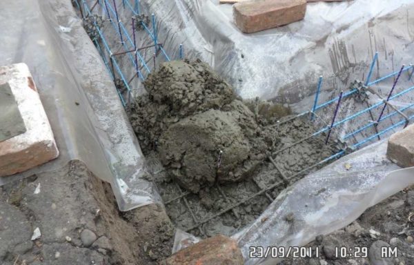 Бетон делаем в бетономешалке — небольшие объемы, необходимые на одну заливку, не позволяют заказывать на заводе. Бетон делаем марки М 250 (на 1 часть цемента М 500 требуется 1,9 части песка и 3,1 части щебня, воды — 0,75). Для повышения прочности добавляется полипропиленовая фибра, а в воде растворяется Пенетрон-Адмикс (присадка для большей прочности).