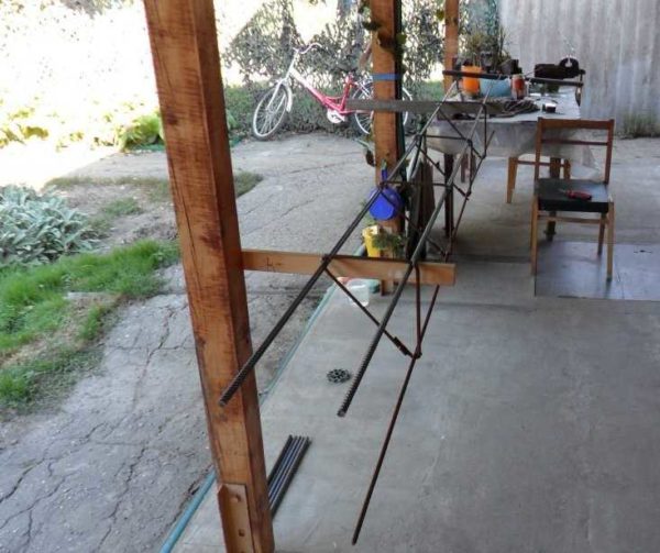 Для увеличения жесткости каркаса углы усилены согнутыми в виде буквы «Г» металлическим прутком (длина стороны 40 см).