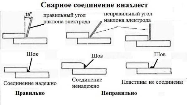 При выполнении шва внахлест, необходимо правильно выбрать угол наклона электрода. Он должен быть порядка 15-45°. Тогда получается надежное соединение. При отклонении в ту или другую сторону основная масса расплавленного металла находится не на стыке, а в стороне, прочность соединения значительно снижается или детали остаются вовсе не соединенными.