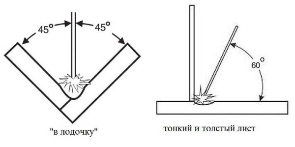 Угловые и тавровые стыки иногда приходится варить с обоих сторон (два шва). Чтобы правильно варить такой шов, детали поворачивают так, чтобы металлические плоскости находились под одинаковым углом. На фото этот способ подписан «в лодочку». Так проще рассчитывать движения электрода, особенно новичку с сварке.