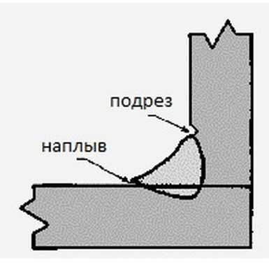 При угловом или тавровом соединении подрез образуется из-за того, что электрод больше направлен на вертикальную плоскость. Тогда металл стекает вниз, снова образуется канавка, но уже по другой причине: слишком сильном нагреве вертикальной части шва. Устраняется снижением силы тока и/или укорочением дуги.