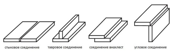 Сварные швы в зависимости от вида соединения бывают стыковые (встык), тавровые, внахлест и угловые (Чтобы увеличить размер картинки щелкните по ней правой клавишей мышки)