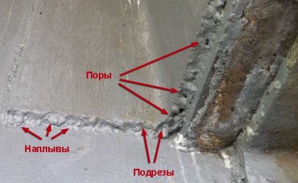 Другие ошибки — при выборе силы тока и величины дуги — можно определить по форме шва. На словах описать их сложно, проще изобразить. На фото ниже показаны основные дефекты формы — подрезы и неравномерное заполнение, прописаны причины, их вызвавшие.