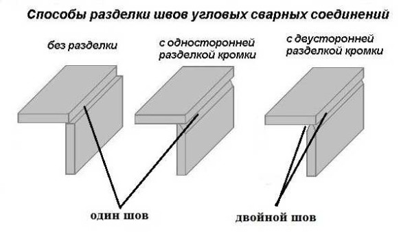 Угловой шов можно рассматривать как часть таврового. Рекомендации тут точно такие же: тонкий металл можно сваривать без разделки кромок, для большей толщины приходится снимать часть с одной или двух сторон.