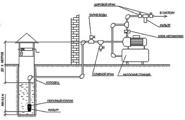 Любая из описанных схем водоснабжения частного дома реализуется при помощи насоса, подающего воду к дому. При этом должен быть сооружен трубопровод, соединяющий колодец или скважину с насосной станцией или накопительным баком. Существуют два варианта укладки труб — только для летнего использования или для всесезонного (зимнего).