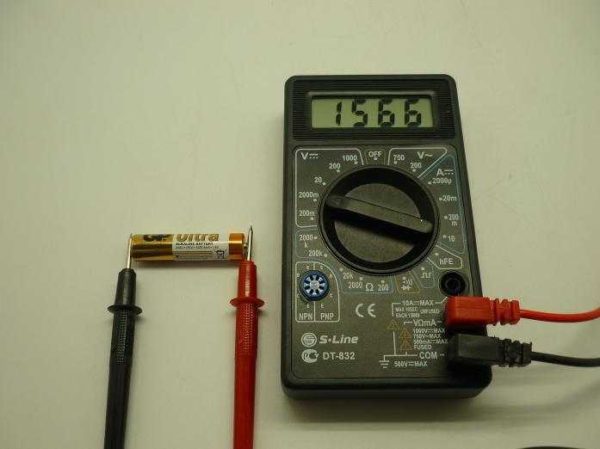 В данном случае измерительный прибор подключается параллельно. Для примера можно измерить напряжение аккумулятора или обычной батарейки. Выставляем переключатель в положение режим измерения постоянного напряжения, так как ожидаемое значение знаем, выбираем подходящую шкалу. Далее щупами касаемся батарейки с двух сторон. Цифры на экране и будут тем напряжением, которое выдает этот элемент питания.