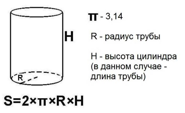 Труба представляет собой очень длинный цилиндр, и площадь поверхность трубы рассчитывается как площадь цилиндра. Для вычислений потребуется радиус (внутренний или наружный — зависит от того, какую поверхность вам надо рассчитать) и длина отрезка, который вам необходим.