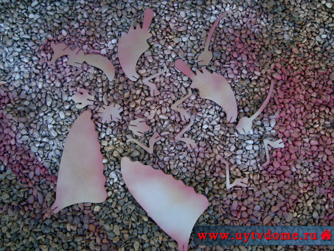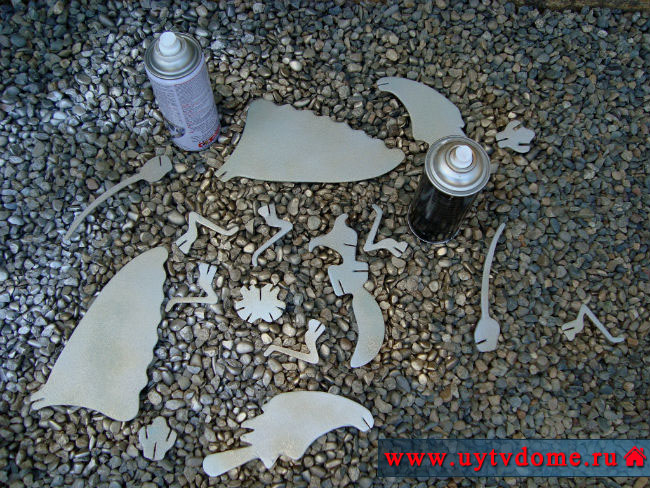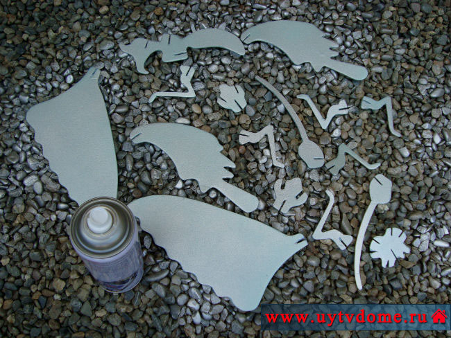 ► Все детали красим с двух сторон, сначала серебристой краской в баллончике, затем золотой краской, в завершении оттеняем розовой краской. ВНИМАНИЕ: краску следует распылять с большого расстояния, в противном случае она разъест материал из которого изготовлена бабочка – пенополистирол.