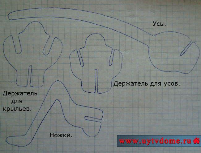 ► Перерисовываем или распечатываем на принтере представленные ниже шаблоны деталей бабочки, вырезаем их и обводим карандашом на листы пенополистирола. Листы пенополистирола продаются упаковками в строительных отделах, там, где торгуют ламинатом, по сути пенополистирол — подложка-гармошка под ламинат (так и называется «подложка-гармошка»).