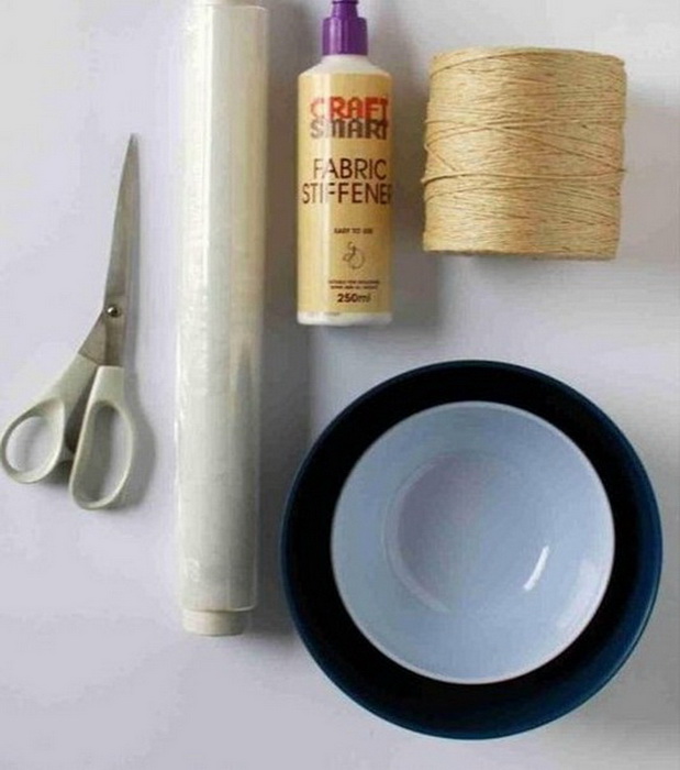 Вам понадобятся ножницы, ваза или миска, которая будет служить формой, нитки, полиэтлен и клей ПВА.