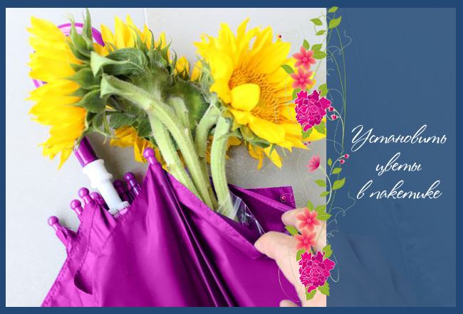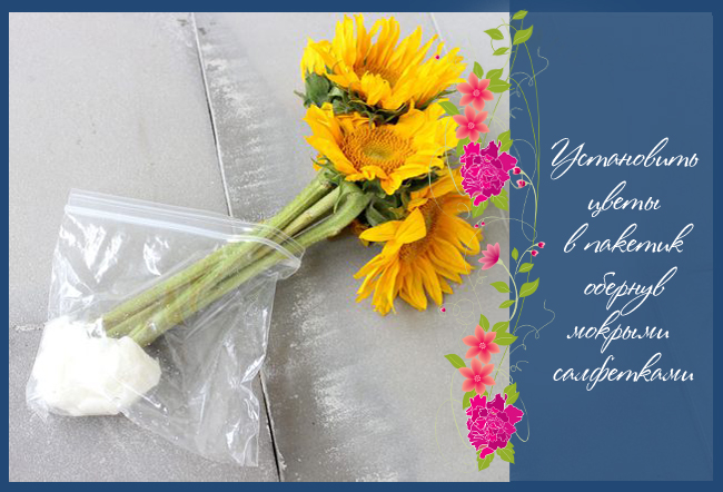 Берем пакетик из плотной пленки, можно воспользоваться файлом для бумаг. Затем обматываем нижнюю часть стеблей цветов несколькими слоями салфеток, после чего все вместе погружаем в воду, салфетки мгновенно впитают влагу. В таком – мокром виде устанавливаем стебли растений в подготовленный пакетик. По желанию сюда можно влить немного воды. Если нальете воду, зафиксируйте пакетик вокруг стеблей цветов денежной резинкой.