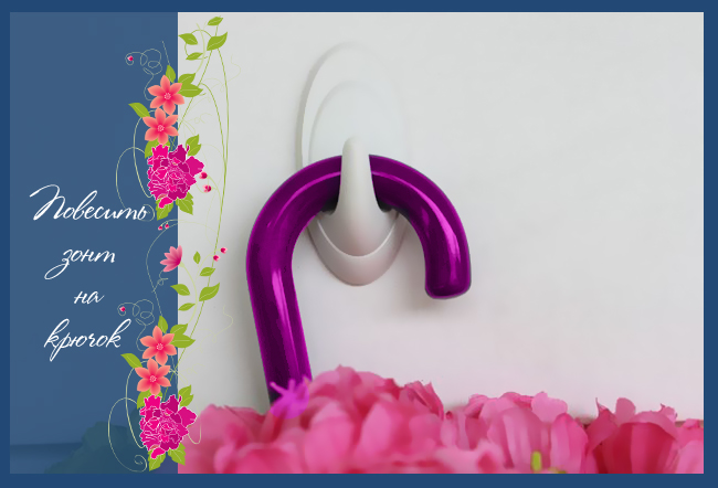 Далее на дверь следует приклеить крючок, и уже на него за крючковатую рукоятку зонта подвесить импровизированную яркую вазу.