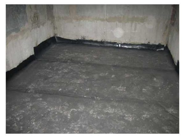 • На основание укладывают гидроизоляционный рулонный материал. Это может быть рулонный Гидроизол, другие подобные материалы. В качестве эконом-варианта подходит плотная полиэтиленовая пленка (плотность 250 г/м и более). Гидроизоляция укладывается по всем правилам: с захлестами одного полотна на другое, тщательным проклеиванием стыков мастикой. Кроме того, материал примерно на 20 см заводят нас стены (тоже промазывают мастикой).