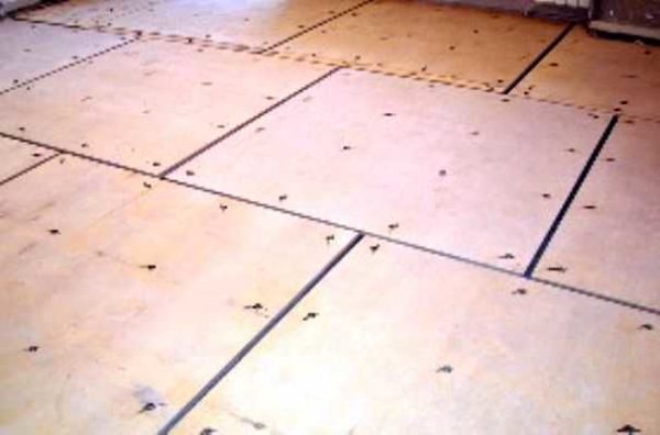 Ее укладывают вразбежку — чтобы швы не совпадали. Между листами оставляют зазор в 3-4 мм. Он нужен для компенсации теплового расширения при повышении температуры. Крепят фанеру по периметру гвоздями к черновому полу, затем посередине в шахматном порядке (расстояние между крепежом — около 15 см). Швы заделывают влагостойким герметиком, который после высыхания не становится жестким.