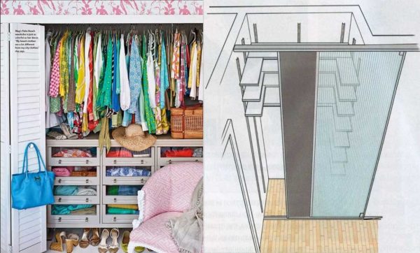 Если одна из стенок бывшей кладовки выходит в спальню, в гардеробной из кладовки наполнение подбирается по-другому. Большей частью тут будет находится весь сезонный гардероб — все, что носится в данный момент. Потому отделений требуется больше. Для платьев, костюмов, юбок и брюк нужны отделения с вешалками. При достаточной высоте потолка (2,5 — 2,7 м) можно расположить два отделения для хранения вещей на вешалках: один над другим. В нижней части можно установить обычную трубу, в верхней удобнее будет пантограф. Пантограф — это труба, оснащенная механизмом, который позволяет ее опускать и поднимать.