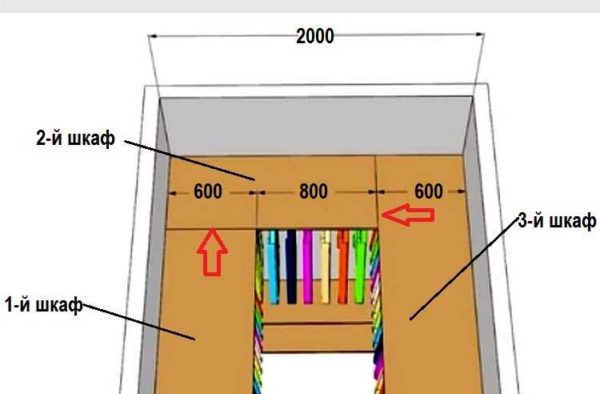 При ширине гардеробной от 2 метров и больше уже можно делать трехстороннее размещение вещей. Для этого делают три шкафа с перехлестом — один шкаф перекрывает другой. В этом случае зону слева делают короче, ставят второй шкаф, длина которого на 60 см короче ширины кладовки. И только зона справа от входа занимает место от одной стены до другой (смотрите рисунок выше).