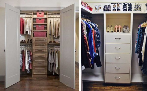 Чтобы при такой планировке вещи не мешали закрывать/открывать двери, у входа устанавливают зону полок, ширина которых 30-40 см. Тут можно хранить обувь в коробках, разместить ящики для нижнего белья и мелочей, полки для свитеров/джемперов и т.п. Дальше уже можно устраивать зону хранения на вешалках шириной 60 см.