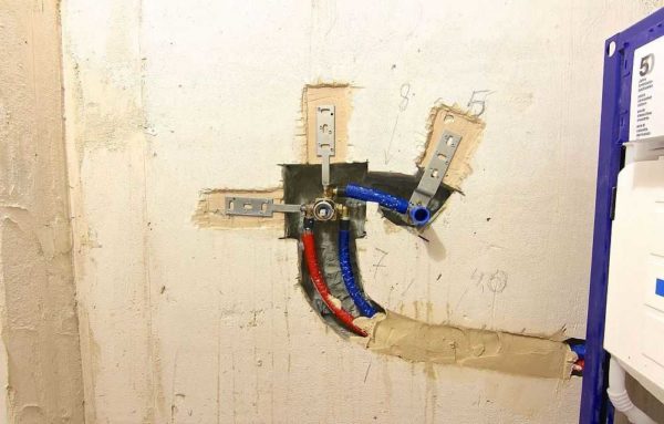 Штатный же монтаж предусматривает штробление стен, укладку в штробы подводящих труб горячей и холодной воды и на завершающем этапе — установку самого смесителя.