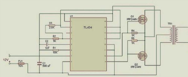 Построена схема на популярном ШИМ-контроллере TLT494. Полевые транзисторы  Q1 Q2 надо размещать на радиаторах, желательно — раздельных. При установке на одном радиаторе, под транзисторы уложить изолирующую прокладку. Вместо указанных на схеме IRFZ244 можно использовать близкие по характеристикам IRFZ46 или RFZ48.