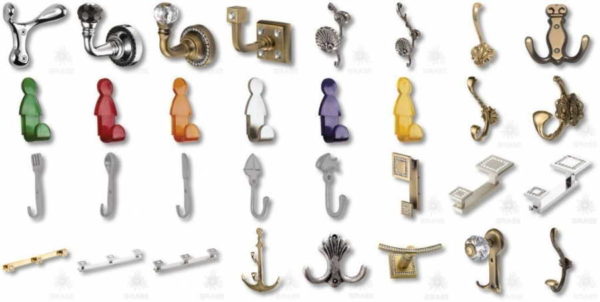 Некоторые виды мебельных крючков из металла, а есть еще и пластиковые