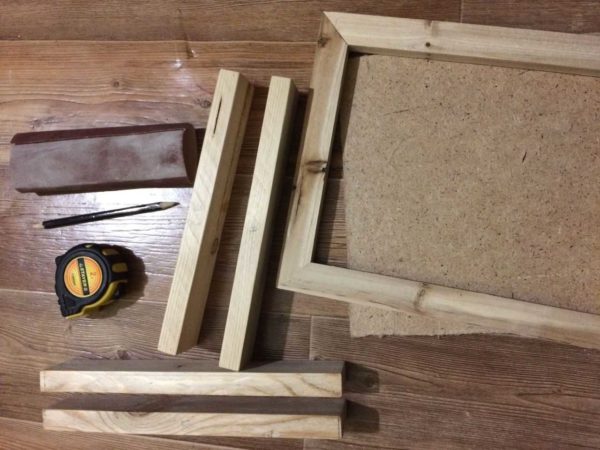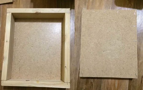 Первым делом бруски напилили по размерам рамки. Соединили при помощи скоб из степлера. Получилась рамка той части, которую вешают на стену. По размеру вырезали кусок ДВП и тоже скобами прикрепили к каркасу.