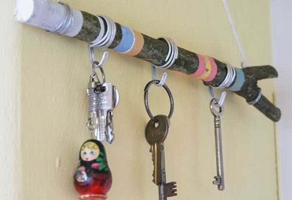 Обычную палку тоже можно превратить в ключницу. Из алюминиевой проводки сделать крючки, обмотать их вокруг палки, украсить ее цветным шпагатом, разрисовать красками. Закрепить на стене тоже не проблема — веревка привязывается с двух концов, цепляется за гвоздик или крючок.