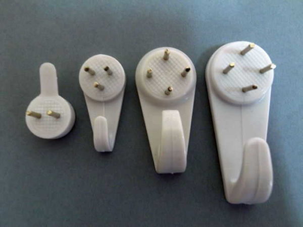 Есть еще крючки для картин (на фото ниже). Они сделаны из пластика, в корпусе имеют несколько металлических штырей. Эти штыри забиваются молотком, причем без проблем входят даже в бетон. Единственный минус этого вариант — немала цена. А так, и смотрятся неплохо, и держатся хорошо.