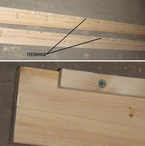 Берем одну боковину, крепим к ней саморезами деревянную планку 25*25 мм минимум. Саморезы устанавливаем через 20-30 см. Спереди в торец планки крепим доску-ограничитель. Повторяем ту же операцию на второй части (обязательно крепить планки на той же высоте).