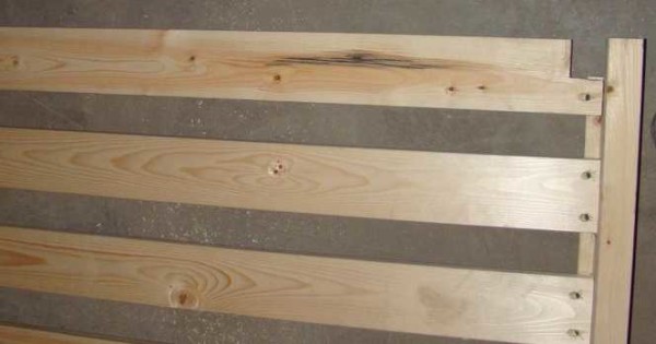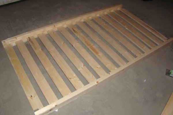 Из доски 25*100 мм нарезаем планки по ширине матраса (можно снова добавить 1-2 см). Их крепят к сделанным только что планкам с упором. Шаг установки — 10 см,на каждую планку — по 2 самореза с каждой стороны. Под каждый саморез предварительно сверлится отверстие (диаметр сверла на 1-2 см меньше диаметра самореза), шляпка должна уходить в древесину.