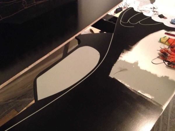 После того как грунт высох, первыми прокрасили зоны, которые должны быть серыми. По замыслу также имеются тонкие серые полоски. Чтобы не рисовать их на черном, по верой краске приклеена тонкая полоска малярного скотча (3 мм), сняв которую потом получим требуемый рисунок.